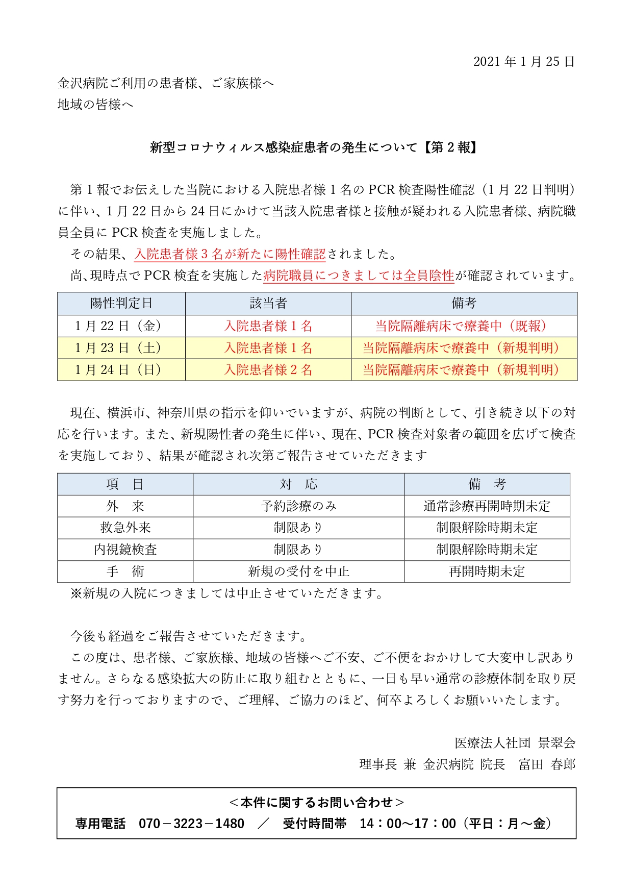 2021.1.27【重要なお知らせ】当院における新型コロナウイルス感染症の発生について(第3報)